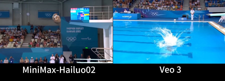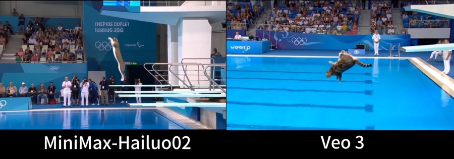谷歌Veo3和Hailuo 02各自生成“猫跳水”视频对比,谷歌Veo3视频中猫直接入水,Hailuo 02视频中的猫在空中完整翻转三周半后入水,动作全程符合逻辑。