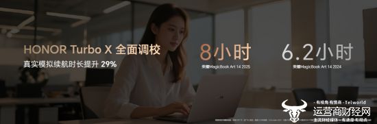 相比前代,荣耀MagicBook Art 14 2025的CPU多核性能提升20%以上,AI算力提升2.5倍,GPU性能提升22%,能效提升21%。同时,在HONOR Turbo X全面调校下,办公场景下的真实模拟续航达到8小时,比上代提升29%,为用户提供更强劲、持久的生产力。