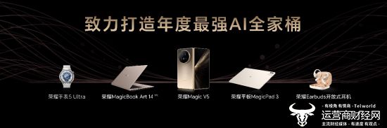 此外,本次发布会荣耀还带来AI终端生态家族的全家桶旗舰新品。全球最薄、地表最强折叠屏荣耀Magic V5,以突破性的制造工艺和技术创新、全面满血的旗舰性能配置,以及AI智能体的多功能应用、多生态覆盖,再次定义折叠旗舰新标准;荣耀平板MagicPad3 13.3英寸大屏旗舰平板,首发全局 AI 生产力,业内首次实现与 iOS、鸿蒙、安卓系统手机无缝互传,打造大屏旗舰最强AI平板;钛合金蓝宝石高端旗舰手表荣耀手表5 Ultra首发防猝筛查研究,24小时守护心脏健康,重新定义腕上智能健康;荣耀Earbuds开放式耳机支持AI翻译,随时调用YOYO,是用户贴身的AI私人助理。