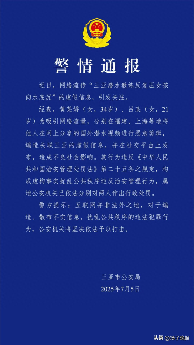 7月5日,三亚市公安局发布警情通报:近日,网络流传“三亚潜水教练反复压女孩向水底沉”的虚假信息,引发关注。