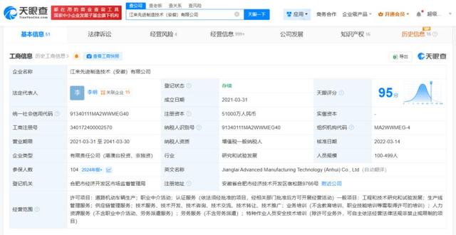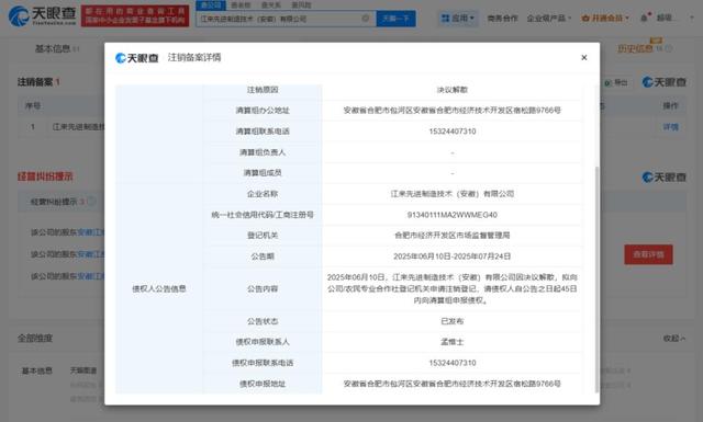 7月7日,天眼查App显示,近日,江来先进制造技术(安徽)有限公司新增1条注销备案公告,注销原因为决议解散,公告期为6月10日至7月24日。该公司成立于2021年3月,法定代表人为李明,注册资本5.1亿元人民币,经营范围包括道路机动车辆生产、生产线管理服务、供应链管理服务等,由蔚来控股有限公司、安徽江淮汽车集团股份有限公司共同持股。