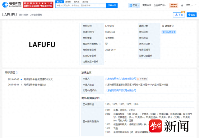 近日,北京泡泡玛特文化创意有限公司申请注册“LAFUFU”商标,国际分类为健身器材,当前商标状态为等待实质审查。据天眼查财产线索信息显示,商标申请日期为2025年6月,类型为普通商标。此外,另据媒体报道,一位泡泡玛特知情人士表示,“LAFUFU”商标属于主动防御性注册,目的是为了更好地打击侵权行为。