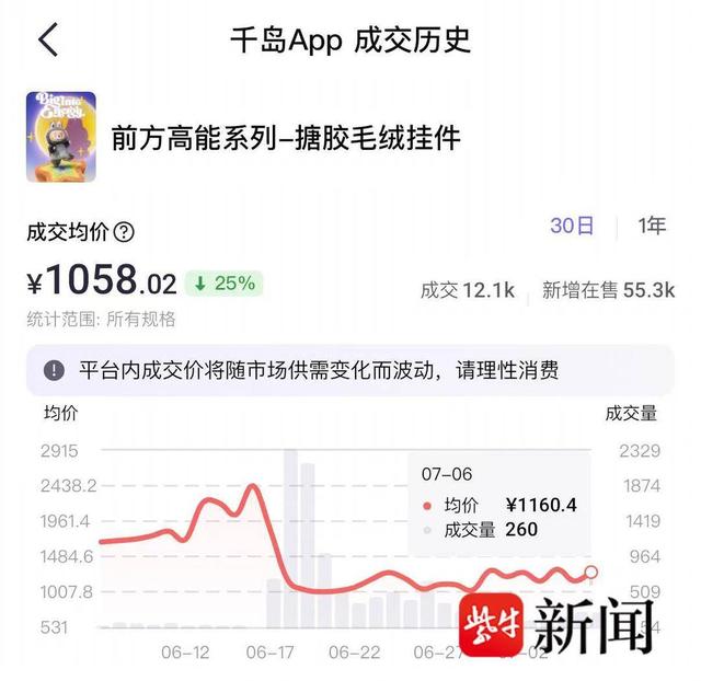 此前,LABUBU3.0开启线上预售,致二手价“崩盘”的消息引起热议。今年6月18日前后,泡泡玛特THE MONSTERS前方高能系列—搪胶毛绒挂件盲盒(LABUBU 3.0系列)在泡泡玛特官方商城小程序等渠道补货,并将预售期延长至今年9月22日,此举引发二手市场的Labubu3.0价格下跌。据潮玩二手交易平台千岛APP显示,从5月份开始,Labubu3.0(前方高能系列)的成交价呈直线上升,6月16日到达最高点,7月6日已经跌至千元左右。