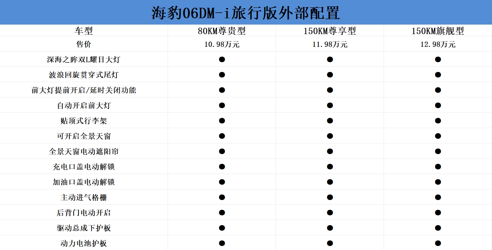 外部配置差异上,三款车型没有明显差异,前后LED灯组、全景天窗、电动遮阳帘、后备厢电动开启等均是标配。目前全景天窗已经成为新能源车的主流配置,虽然拥有视野通透的效果,但因为大部分车型并未主动提供遮阳帘,因此会有夏季高温暴晒的情况。而海豹06DM-i旅行版全系标配电动遮阳帘,能有效避免暴晒、隐私泄露等问题。