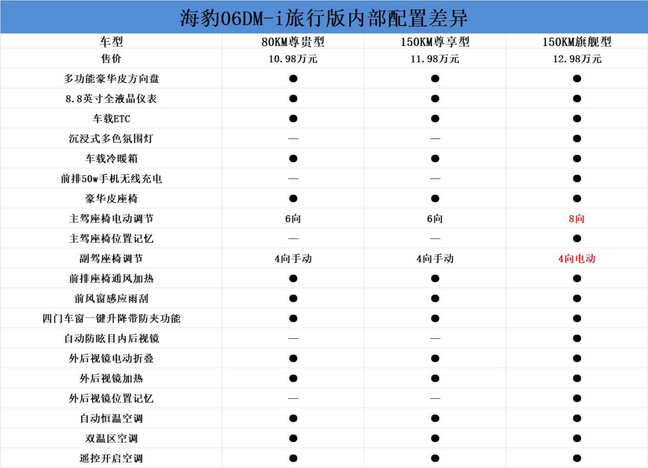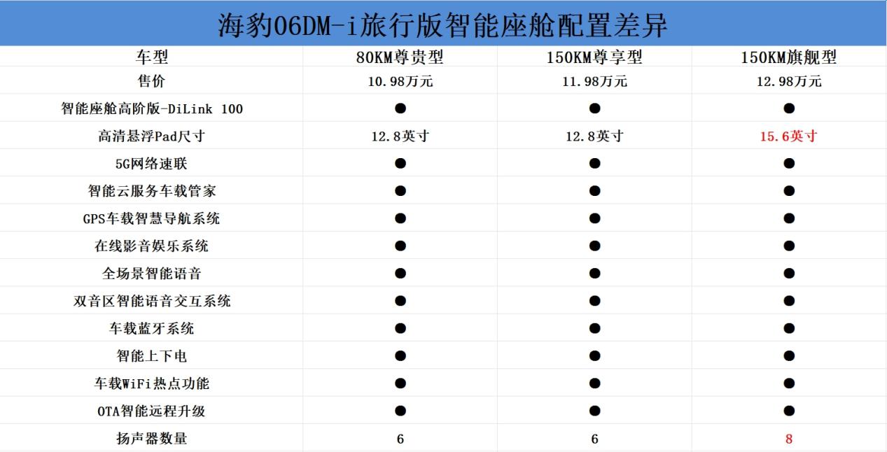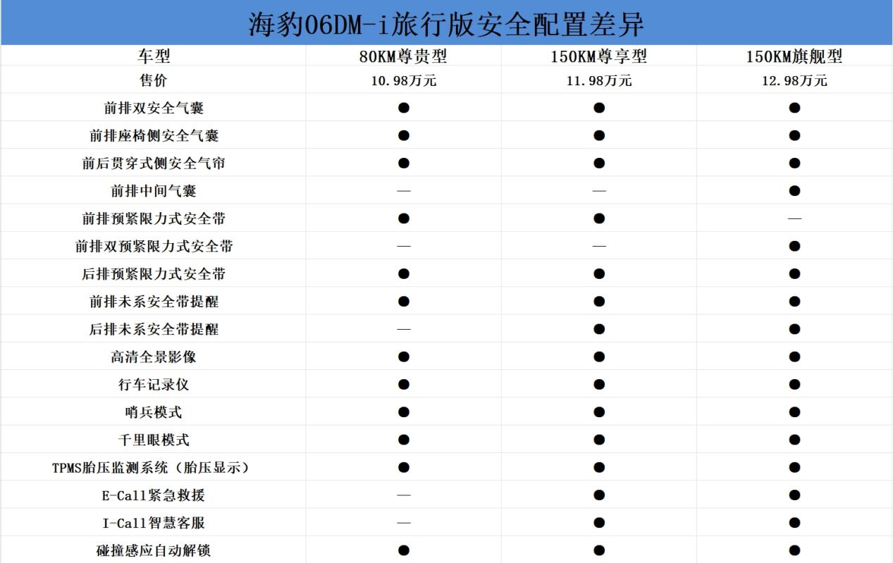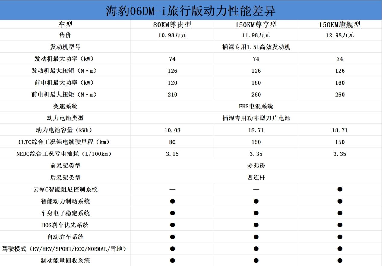 综合来看,海豹06DM-i旅行版全系的配置在该价位区间属于比较丰富的,顶配150KM旗舰型更加具有性价比,其仅比入门车型贵2万元,不仅独享云辇C智能阻尼控制系统,滤震和操控平衡性表现相较于其余车型具有优势,同时舒适性和科技配置更加丰富;如果是城市通勤刚需型,可以考虑售价为10.98万元的80KM尊贵型,80km纯电续航可以基本覆盖日常通勤,同时标配智能驾驶辅助功能,满足日常使用。(屹辰)