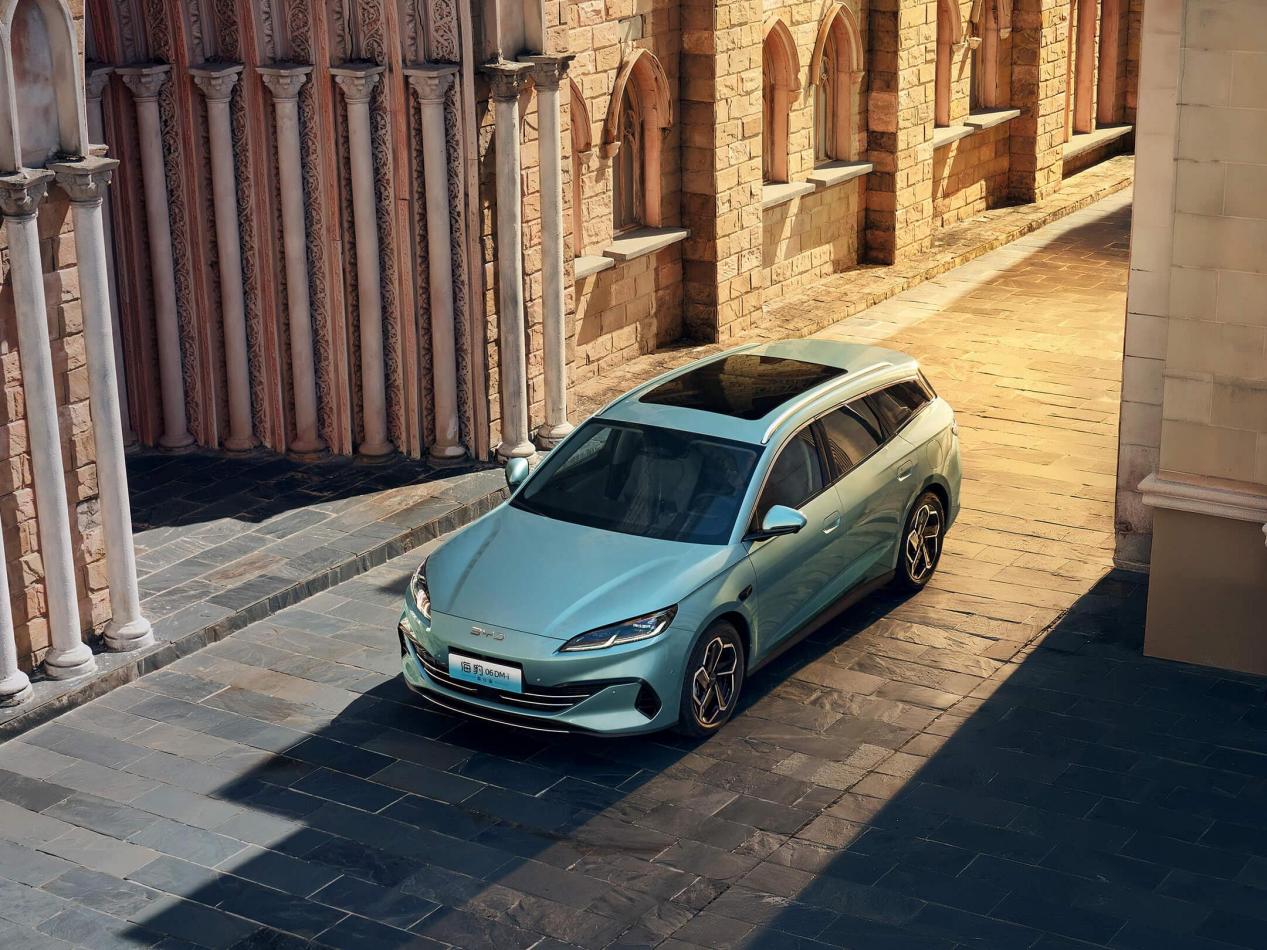 海豹06DM-i旅行版在外观设计上深度融合海洋美学理念与旅行车功能性,通过精准比例控制和细节优化,打造兼具优雅与实用的造型。前脸采用封闭式车头搭配上扬的双L型LED日行灯,灯腔造型凌厉,配合具有运动感的前包围,营造低趴运动的视觉效果。侧面车顶线条从C柱平缓延伸至D柱,形成旅行车经典的溜背造型。尾部采用贯穿式尾灯组,中央镶嵌发光BYD标识,点亮后具有较高的辨识度。