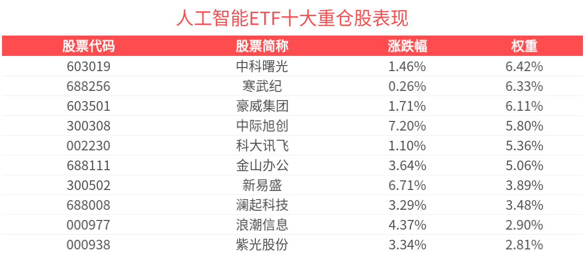 数据显示,截至2025年6月30日,中证人工智能产业指数(931071)前十大权重股分别为中际旭创(300308)、新易盛(300502)、科大讯飞(002230)、豪威集团(603501)、中科曙光(603019)、金山办公(688111)、寒武纪(688256)、澜起科技(688008)、浪潮信息(000977)、海康威视(002415),前十大权重股合计占比52.07%。