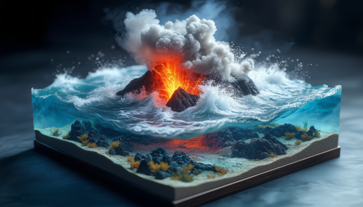 可图2.1在指令遵循上表现亮眼,能精准捕捉提示词中的多元元素、复杂指令及颜色位置等细节。例如,输入“3D微缩沙盘模型,展示其独特的横截面剖面,海底火山爆发的剧烈瞬间,史诗级灾难场景,CG特效,光影对比,冷暖对比”,生成图像清晰呈现场景,通过精细光影与冷暖色调,细腻还原火山爆发奇景。