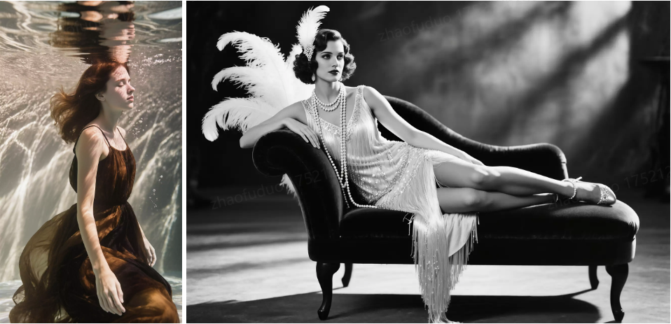 在画面质量上,该模型实现显著突破,清晰度、元素丰富度、细节真实感均达新高度,尤其人像美感突出。如“水下摄影,一位欧洲少女,梦幻光影,水透明肌理反光,迷乱,折射光影,光影弥散,棕黑色系”的指令下,生成图像中人物肌肤纹理细腻,光影自然;“黑白照片,复古风格的摄影棚照片,一位时尚女性斜倚在天鹅绒贵妃椅上,身着流苏裙,佩戴珍珠项链,展现二十年代摩登女郎不经意的优雅”的提示词,也让人物姿态与细节栩栩如生。