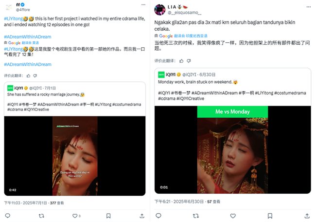 《书卷一梦》讲述了十八线女演员宋小鱼(李一桐饰),意外穿越进剧本世界成为女主角宋一梦,遇到阴狠绝情的男主角南珩(刘宇宁饰),踏上“纸片人”和既定命运抗争的改命之旅的故事。该剧在国际影视社区MyDramaList斩获8.5高分,在TikTok上相关话题阅读量也突破3亿次。海外网友围绕人设、演技以及搞笑剧情展开热烈讨论,李一桐与刘宇宁的出色表演广获好评,观众称赞李一桐治愈“Monday Blue”“刘宇宁是苏感的神”。