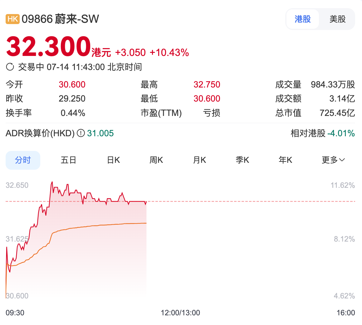 7月14日,港股市场中汽车板块整体表现强势,蔚来股价领涨,截至发稿涨超10%,报32.3港元每股,总市值725.45亿港元。