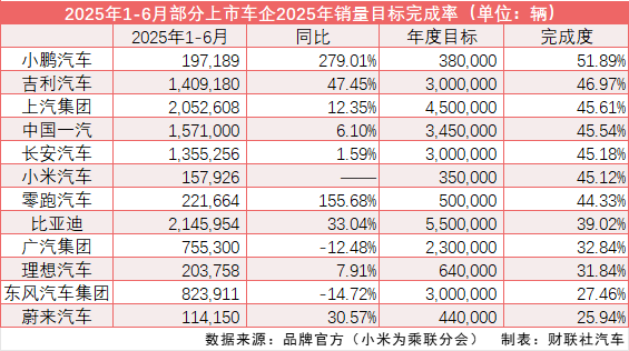 新势力车企中,小米汽车和零跑汽车势头正盛。小米汽车作为后来者,上半年累计交付超过16万辆,年度目标35万辆,完成率46%,6月上市的YU7则有望进一步提升销量;零跑汽车上半年累计交付22.17万辆,同比增长155.68%,首度登顶半年销量榜,其全年目标50万辆,目前完成44.3%。