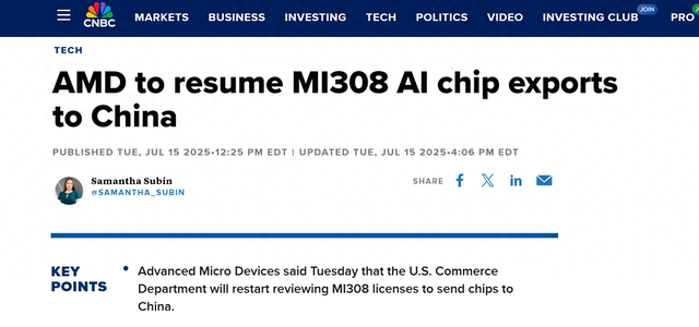 【环球网科技综合报道】7月16日消息,据外媒CNBC报道,美国超微半导体公司(AMD)7月15日表示,美国商务部已告知该公司,其专为中国市场设计的人工智能加速器MI308芯片的出口许可申请将进入审查程序,公司计划在获得批准后重启对华出口该芯片。