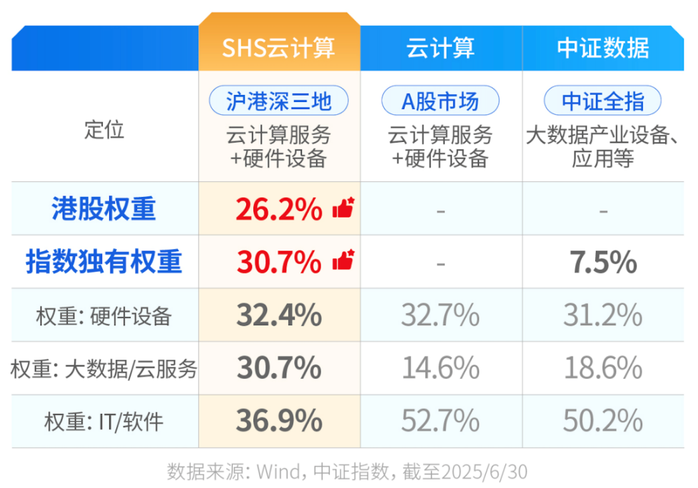 为什么这两个指数能够异军突起?还是和他们的权重有关。首先中证沪港深云计算产业指数顾名思义是涵盖沪港深三地的龙头个股,其优势自然是“港股”。其港股权重达到了26.2%。它通过“A股(硬件+软件)+港股(平台+生态)”的独特模式,构建了一幅远比单一市场指数更完整的产业拼图。