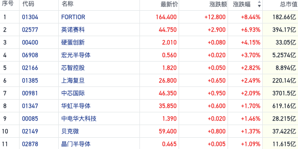 港股半导体芯片股今日再度集体走强。截至发稿,FORTIOR(01304.HK)涨超8%,英诺赛科(02577.HK)涨近7%、华虹半导体(01347.HK)、中芯国际(00981.HK)等多只个股跟涨约2%左右。