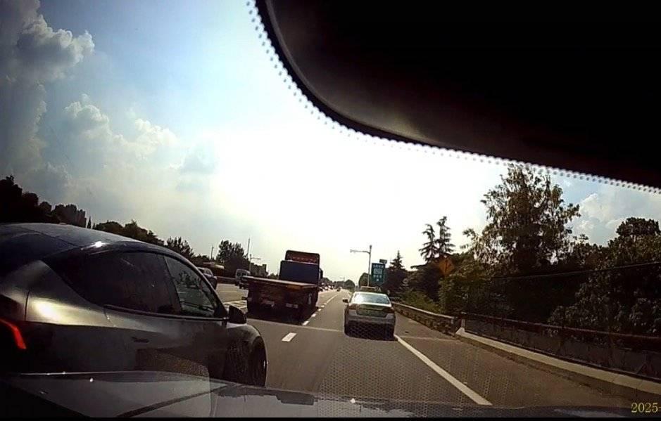 根据网友“桃子”的行车记录仪显示:7月22日下午6点过,她驾车驶入绕城高速北新收费站时,一辆川A牌照的特斯拉汽车曾试图从右侧进行变道插队。桃子称,当时B柱盲区较大没看清该车,自己就正常驾驶,没有对其避让。