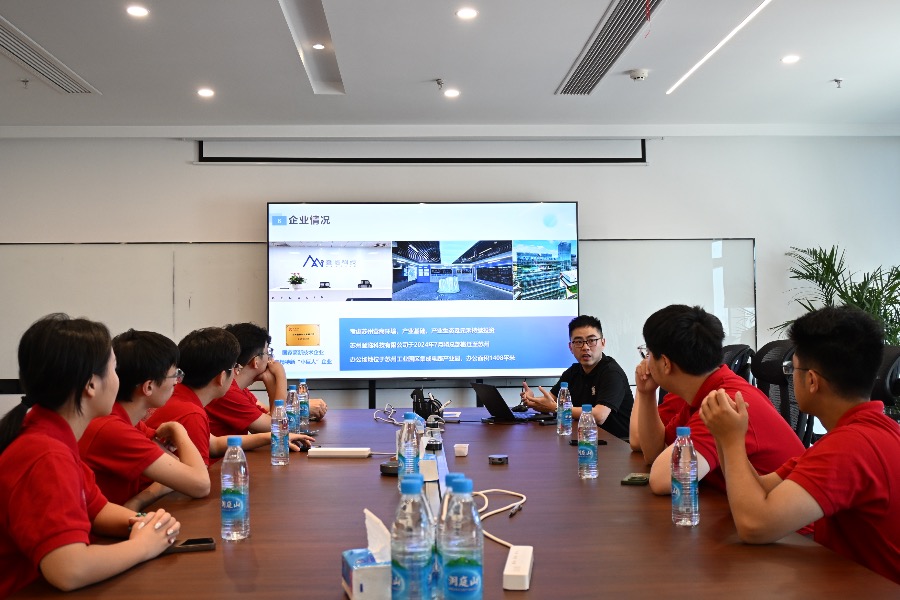 在苏州登临科技有限公司,实践团成员们走进公司展厅,沿着发展时间轴深入了解了企业的成长历程、核心业务布局与前沿技术成果。座谈会上,企业负责人系统介绍了公司在高性能计算芯片领域的突破性创新并与团队成员们热烈交流。“年轻人成长路上,首先要沉下心来踏踏实实做学问、搞研究;其次要真正热爱自己的事业,这份热爱会成为你们克服困难、持续前进的最大动力”,登临科技联合创始人王平深情寄语青年学子。