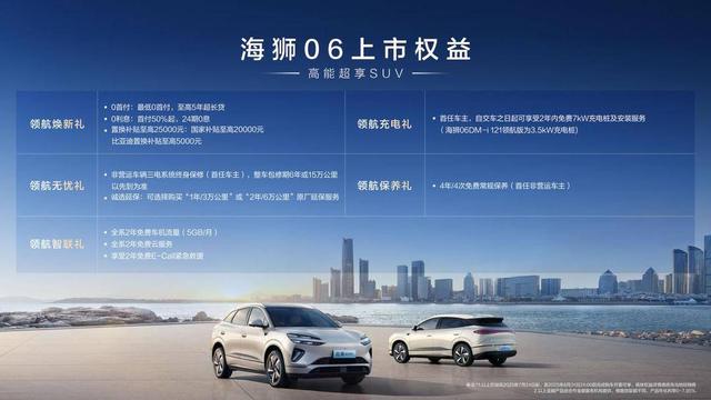 新车特别推出领航焕新礼、领航充电礼、领航无忧礼、领航保养礼、领航智联礼等多重购车礼遇,全方位满足用户的购车需求。作为高能超享SUV,海狮06实现了颜值、安全、舒适、驾控、智能的全维进阶,依托先进的技术创新,重塑出行生态,致力于为用户打造高品质的出行新体验。