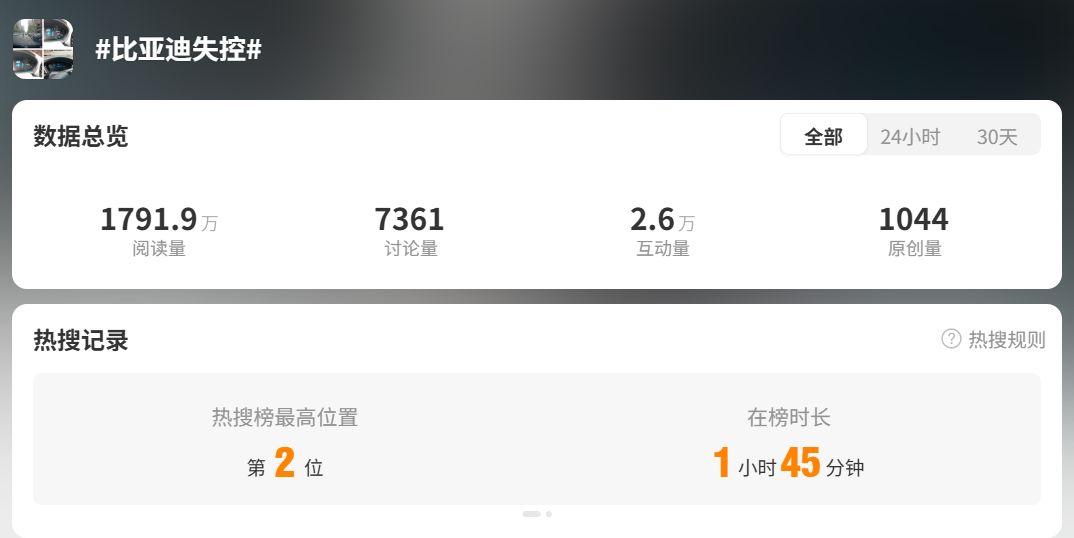 转圈的车辆(视频截图)#比亚迪失控#的词条登上微博热搜榜,最高排在第2位,在榜时长1小时45分钟,阅读量达1791.9万。