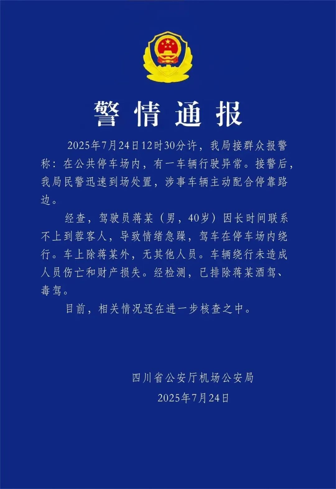 另外,7月24日晚间,四川省公安厅机场公安局发布警情通报。经查,驾驶员蒋某(男,40岁)因长时间联系不上到蓉客人,导致情绪急躁,驾车在停车场内绕行。车上除蒋某外,无其他人员。车辆绕行未造成人员伤亡和财产损失。经检测,已排除蒋某酒驾、毒驾。目前,相关情况还在进一步核查之中。