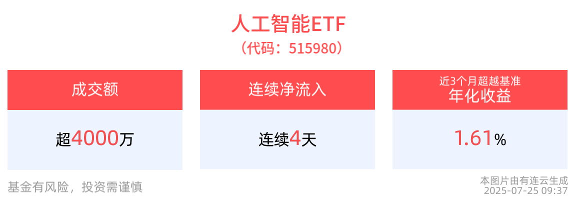 流动性方面,人工智能ETF盘中换手1.22%,成交4021.61万元。拉长时间看,截至7月24日,人工智能ETF近1月日均成交1.66亿元。