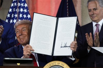 7月23日,美国总统特朗普在华盛顿举办的人工智能峰会上展示他签署的行政命令。 新华社/美联