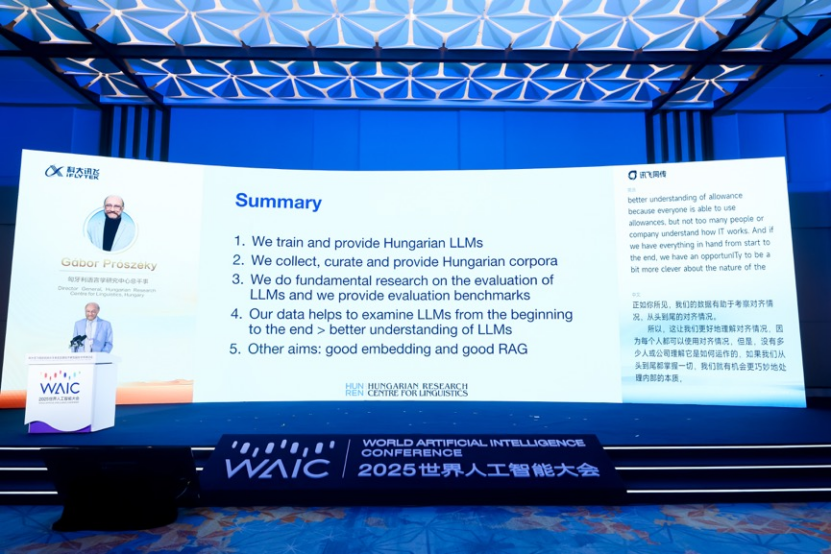 匈牙利语言学研究中心总干事Gábor Prószéky教授强调,数据质量优于数据体量,是构建可信大语言模型的关键。他指出,匈牙利语作为粘着性语言,具有复杂的词缀组合及自由语序,这为大语言模型的token划分和长距离依赖建模带来独特挑战。团队开发的PULI模型家族已促成与中国AI同行的合作,通过HuGME评估框架实现了从训练、语料建设到实际应用的完整闭环。