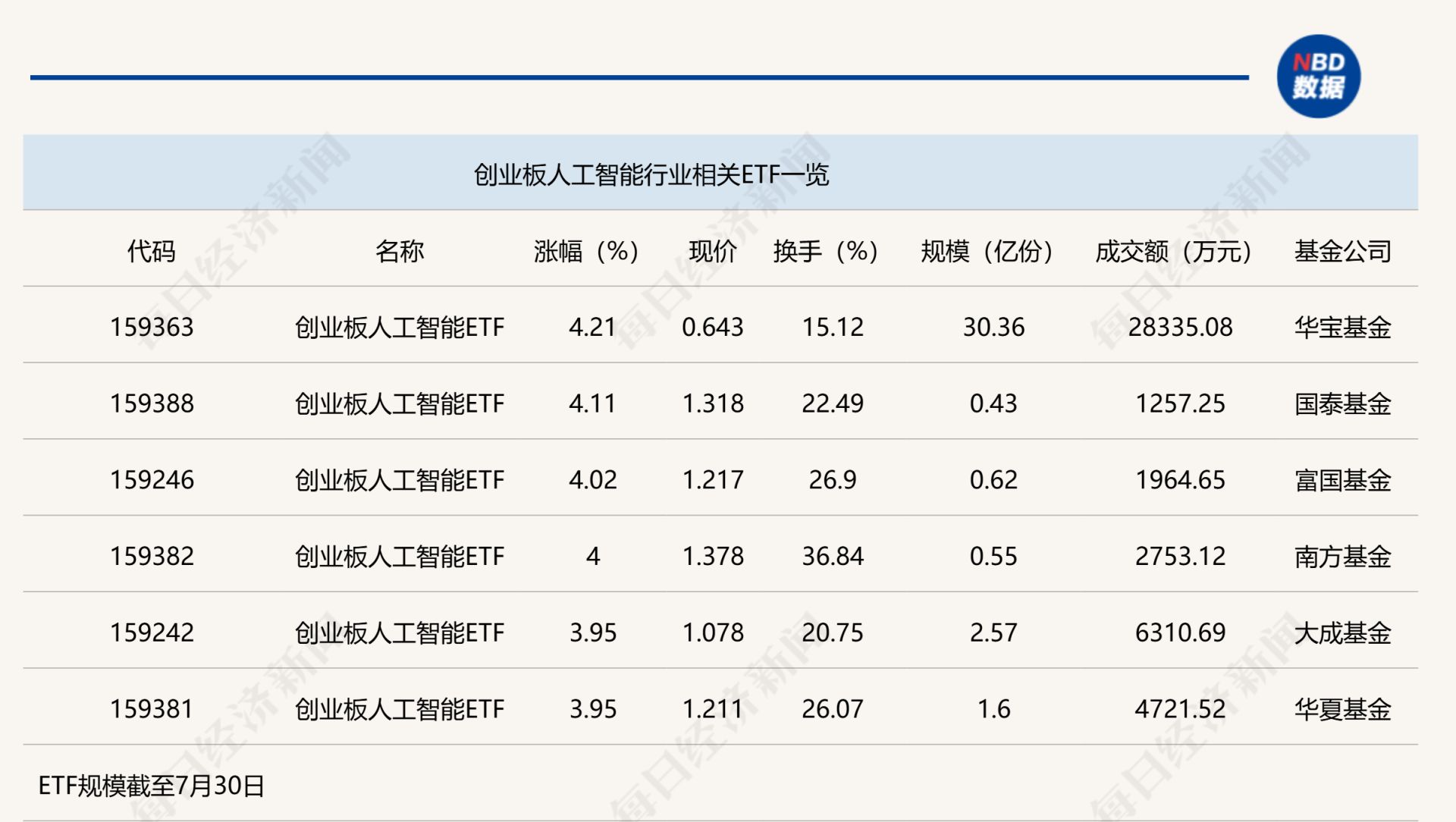 今日上午,创业板人工智能板块表现抢眼,包括创业板人工智能ETF(159363)在内的4只行业ETF半日涨幅达到4%,领涨整个ETF市场。其中,创业板人工智能ETF(159363)半日成交额达到2.83亿元,交投活跃。