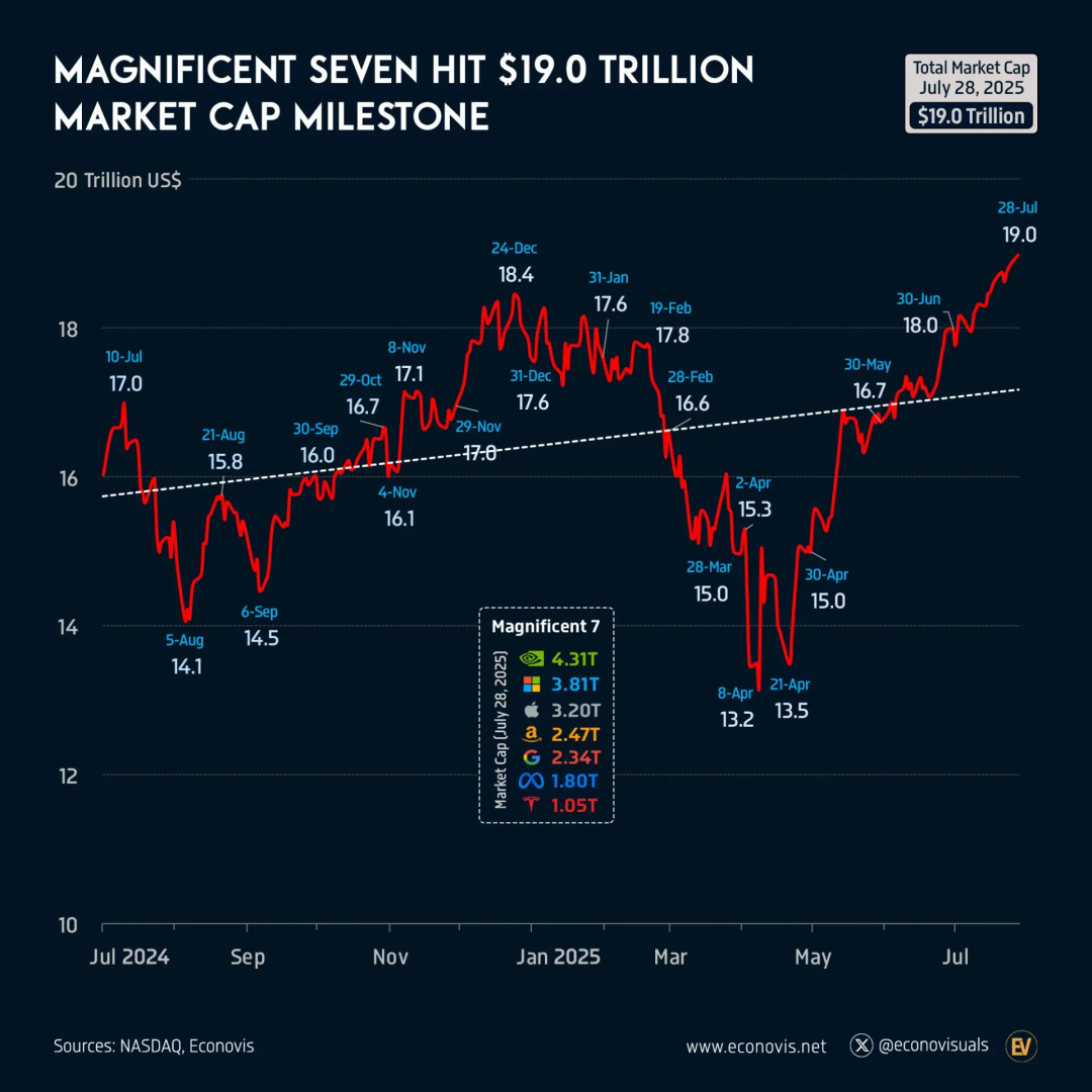 截至7月28 日,“七大科技巨头” 苹果、微软、英伟达、Alphabet、亚马逊、Meta Platforms和特斯拉——的总市值达到创纪录的19.0万亿美元,较年初增长1.4万亿美元,增幅为7.7%。