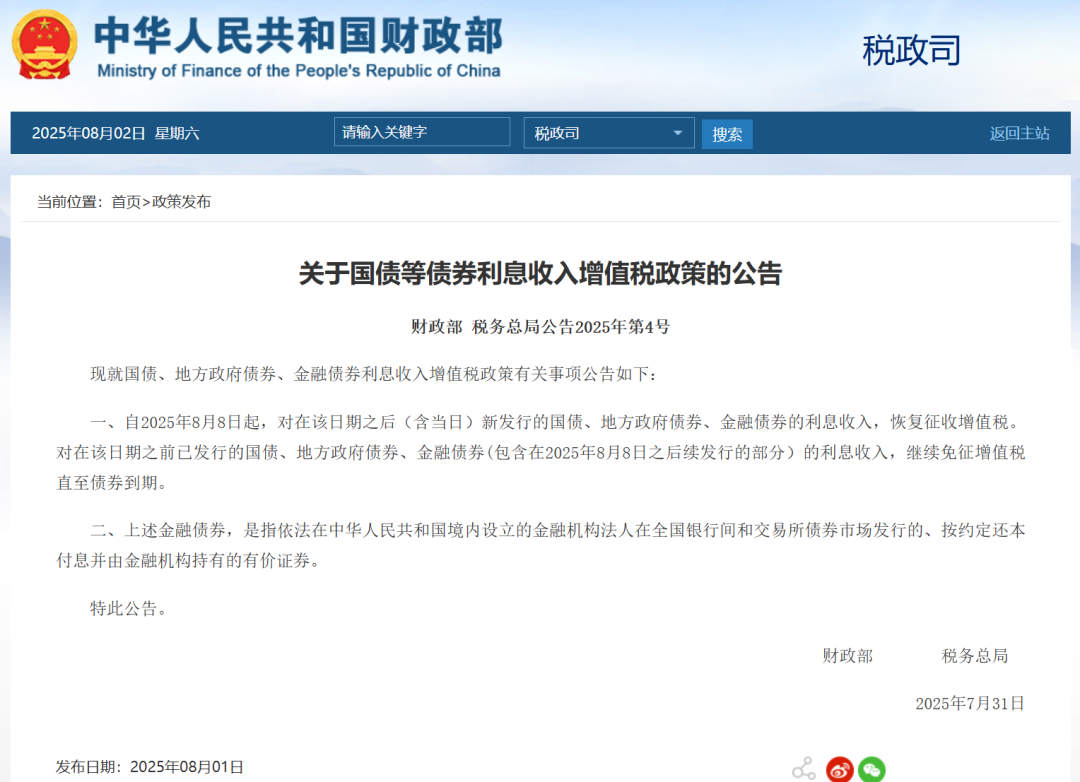 公告显示,自2025年8月8日起,对在该日期之后(含当日)新发行的国债、地方政府债券、金融债券的利息收入,恢复征收增值税。此次政策调整采用“新老划断”原则,对8月8日前已发行的相关债券利息收入,继续免征增值税直至债券到期。