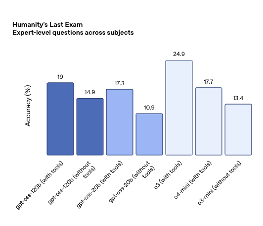 就模型性能而言,GPT-OSS大致位于开源模型的第一梯队,但整体略逊于自家的GPT-o3和o4-mini。