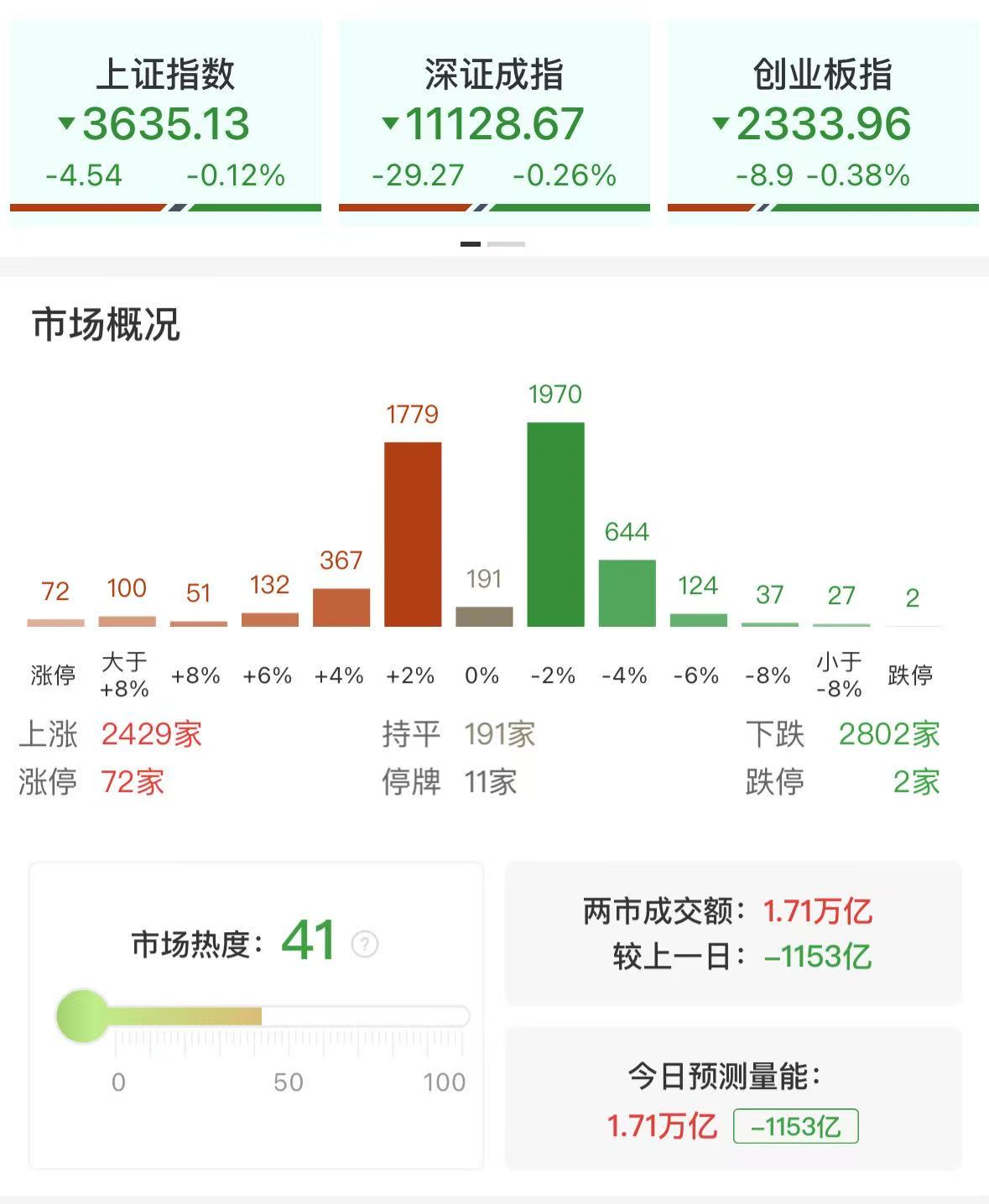 财联社8月8日讯,市场全天窄幅震荡,三大指数小幅下跌。沪深两市全天成交额1.71万亿,较上个交易日缩量1153亿。盘面上,市场热点较为杂乱,个股跌多涨少,全市场超2800只个股下跌。从板块来看,新疆本地股午后爆发,八一钢铁等10余股涨停。超级水电概念股展开反弹,山河智能涨停。高铁概念股震荡走强,金鹰重工20CM涨停。下跌方面,AI应用股集体大跌,鼎捷数智等多股跌超10%。截至收盘,沪指跌0.12%,深成指跌0.26%,创业板指跌0.38%。