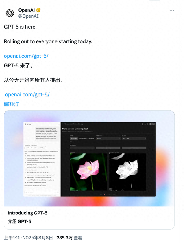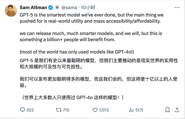 OpenAI首席执行官萨姆·奥尔特曼(Sam Altman)在推文中称,GPT-5是“我们有史以来最聪明的模型”。