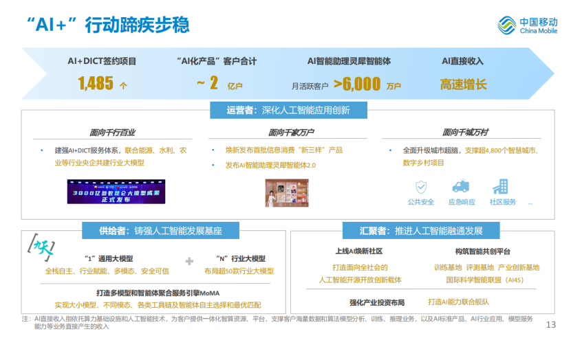 “AI+”行动蹄疾步稳。“AI+”核心能力加速锻造,打造多模型和智能体聚合服务引擎MoMA,“九天”通专大模型矩阵全新升级,布局超50款行业大模型。“AI+”生态汇聚深入推进,人工智能“焕新社区”正式发布,聚合央企和产业链力量共同打造国家级AI开源开放创新平台。“AI+”应用创新百花齐放,AI+规模效应初步显现。灵犀智能体月活跃客户超6000万户。AI直接收入实现高速增长。