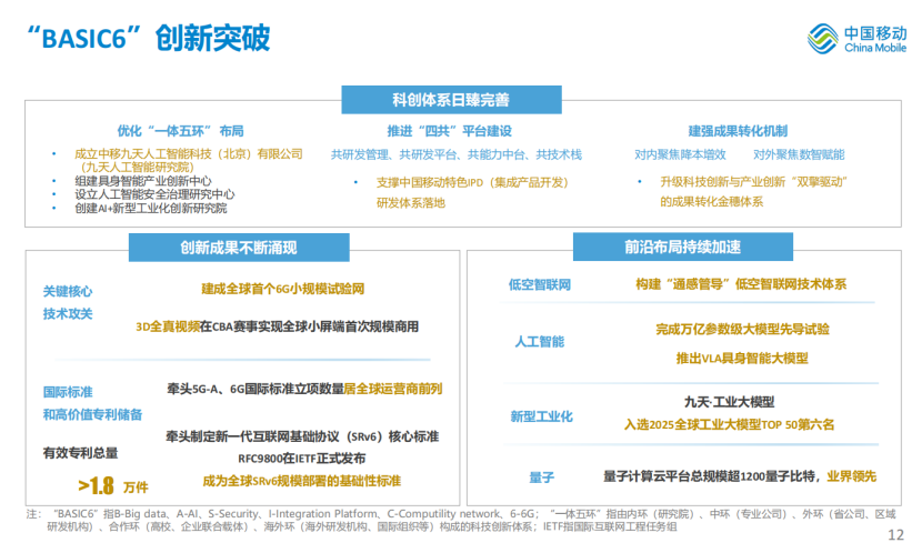 “BASIC6”创新突破。以“BASIC6”为核心构建优势科创能力,深度赋能“两个新型”升级计划、“AI+”行动计划,驱动转型发展创新突破。科创体系日臻完善,优化“一体五环”布局,成立中移九天人工智能科技公司、具身智能产业创新中心等研发机构。创新成果不断涌现,建成全球首个6G小规模试验网,牵头5G-A、6G国际标准立项数量居全球运营商前列。前沿布局持续加速,完成万亿参数级大模型先导试验,推出VLA具身智能大模型。
