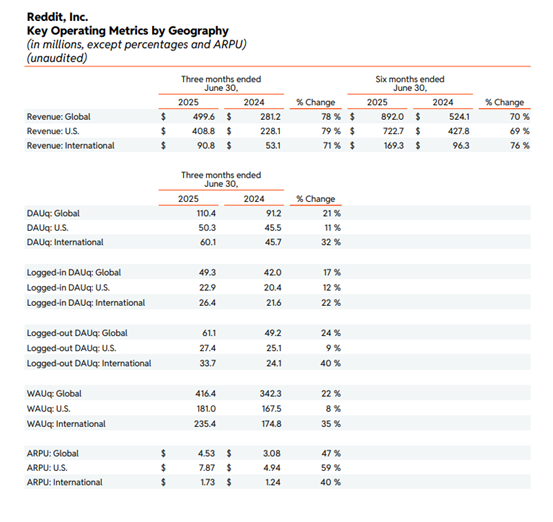 Q2 Reddit 的日活跃独立用户达1.104 亿,同比增长21%;周活跃用户4亿,同比增长22%。虽然环比增速有所放缓(约2%),但 Reddit 在“基于兴趣、与陌生人高质量交流”的社交细分领域几乎没有直接替代者。