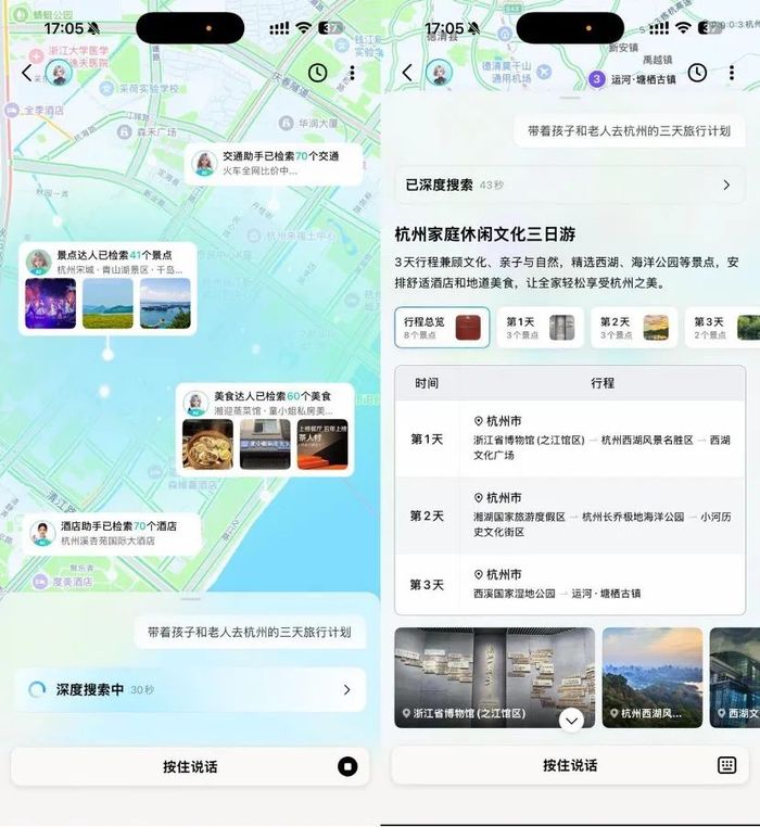 当下,ChatGPT和DeepSeek已经培养了用户通过AI连续对话,寻求更复杂问题答案的习惯,在这个过程中,传统对话式AI实际解决的是信息搜寻和整合难题,但在面对出行这个涉及更复杂时空因素的难题时,传统AI仍有心无力——因为人们的出行需求,已不再仅仅是从A点到B点的路径抵达,而是如何更好的享受探索旅程的乐趣,好好欣赏沿途的风景。