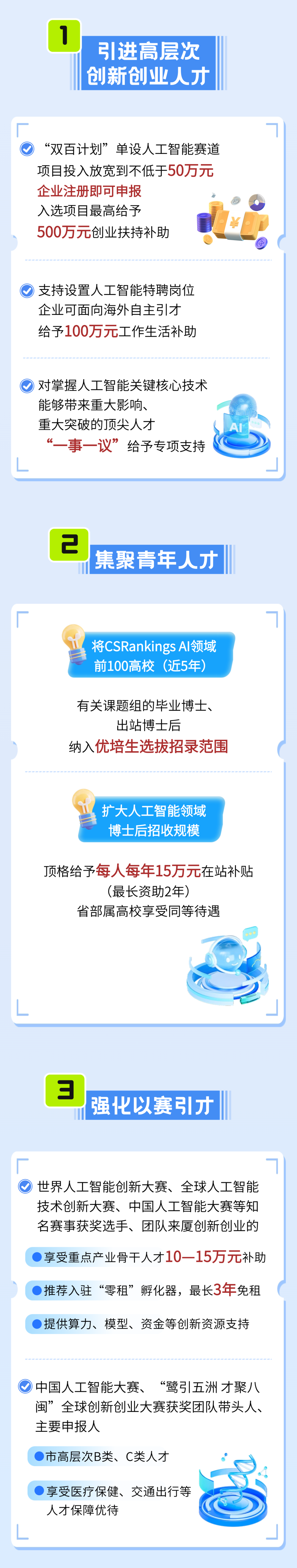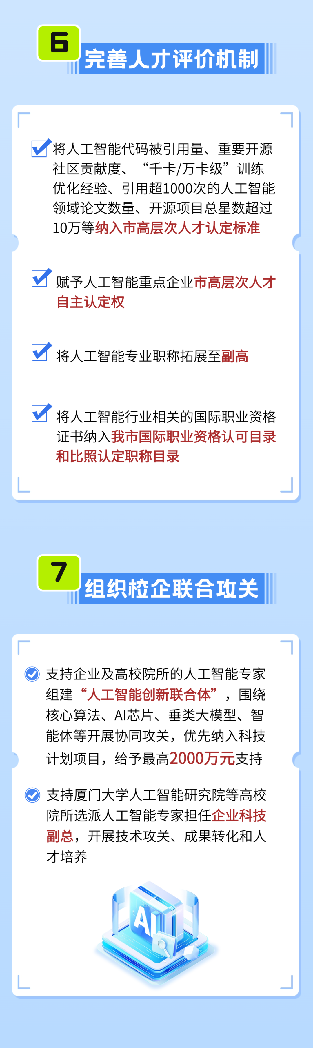 为吸引集聚人工智能产业发展急需紧缺人才,支持人工智能产业实现核心技术突破、规模能级提升、生态要素集聚,厦门市出台实施“AI产业人才8条”,围绕人才引进、培养、评价、激励等方面出台支持举措,以人才支撑助力产业高质量发展。