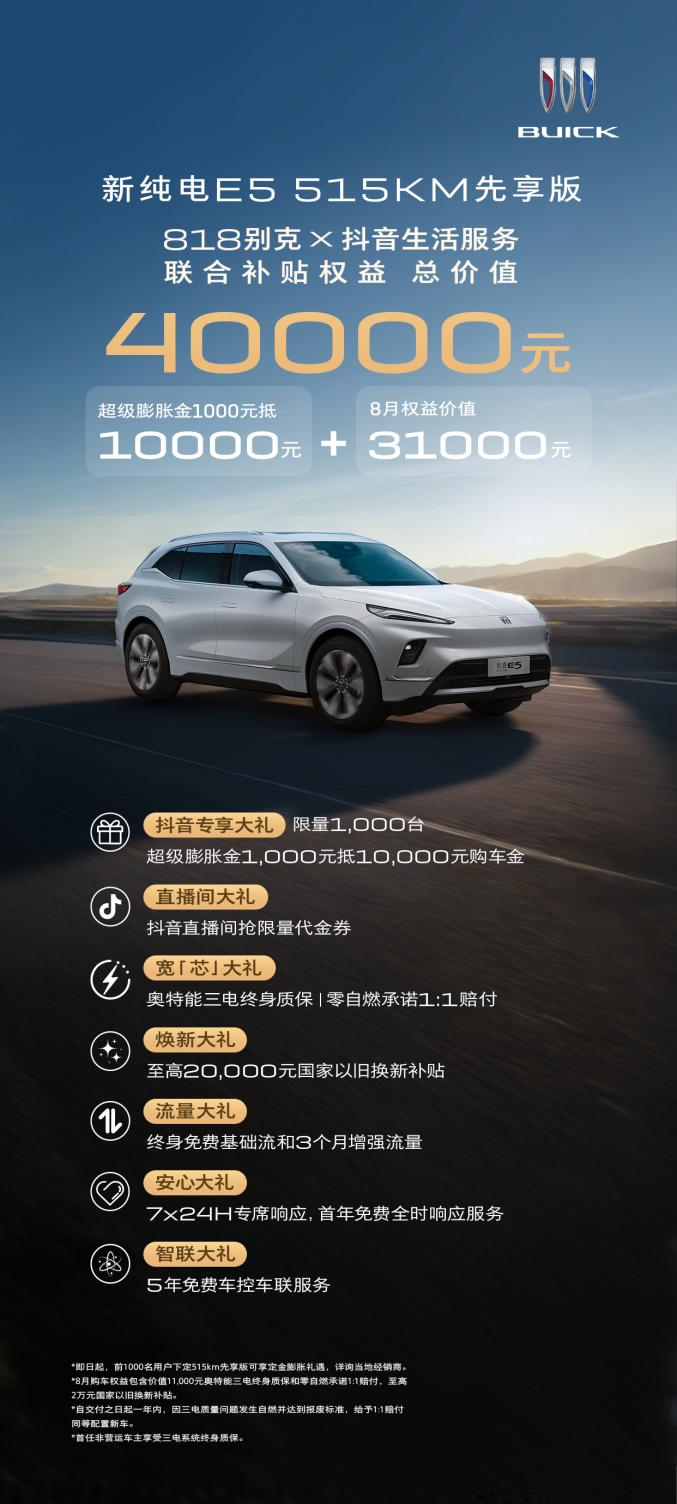 此次联合抖音生活服务补贴,购先享版享1000抵10000元膨胀金,叠加至高2万置换补贴、奥特能三电终身质保等,总价值4万元。