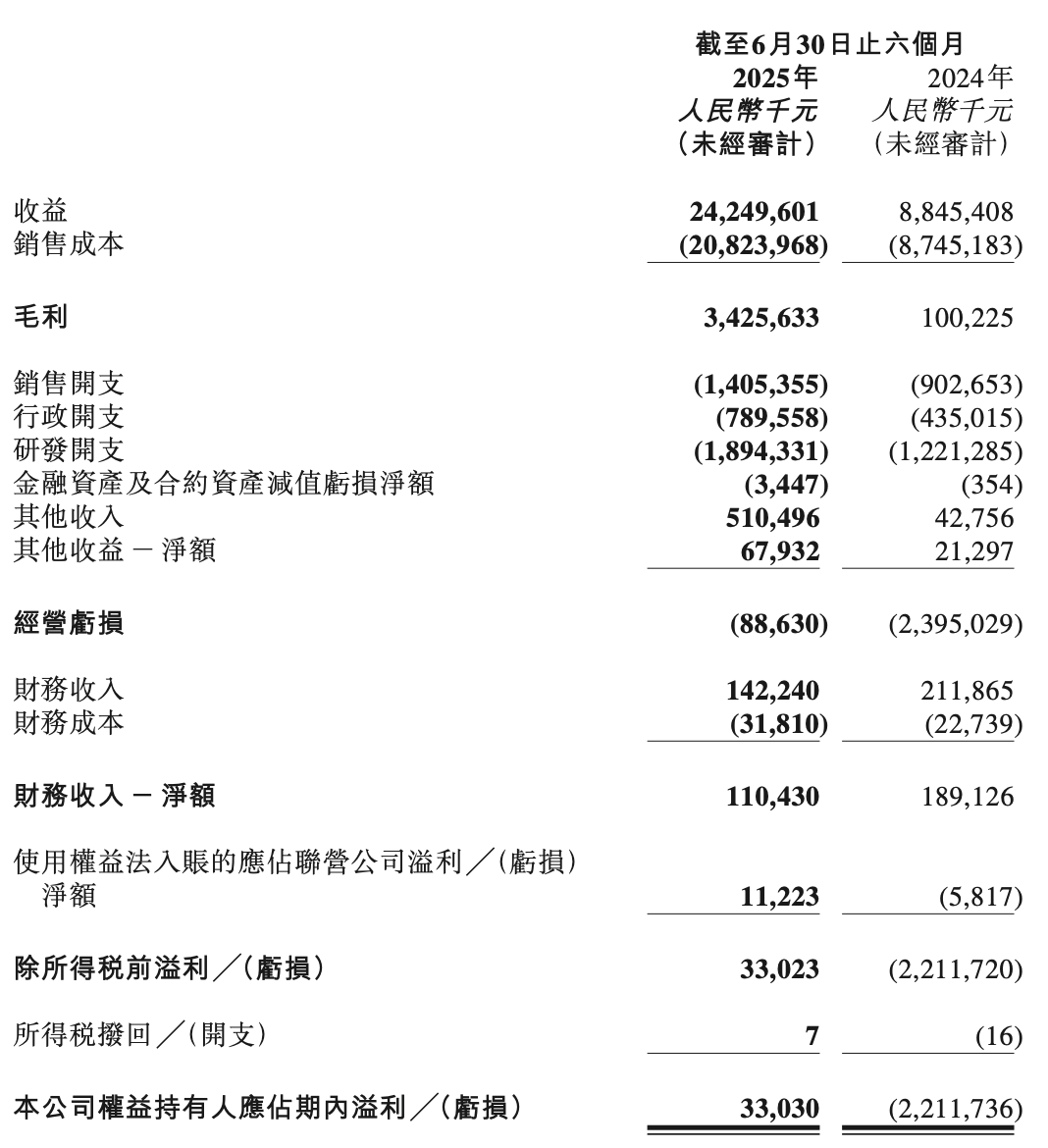 8月18日,零跑汽车(09863.HK)在港交所公告,2025年上半年公司实现营收242.5亿元,同比增加174%;净利润为0.3亿元,首次实现半年度净利润转正,去年同期为净亏损22.1亿元。