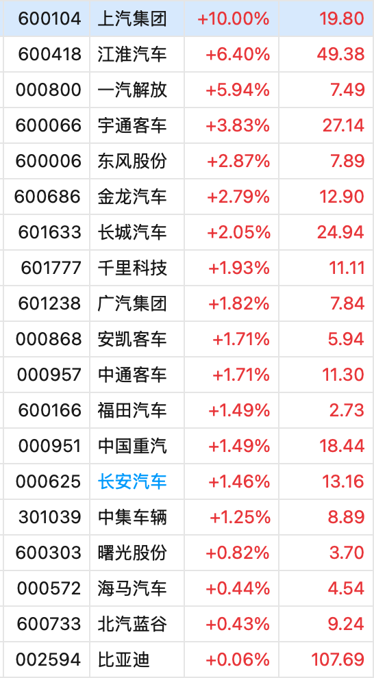 受消息影响,午后汽车整车板块异动,上汽集团涨停,一汽解放一度触及涨停,江淮汽车、宇通客车、东风股份、东风股份、金龙汽车、长城洗车等跟涨。