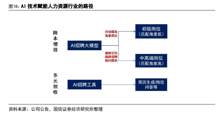 国信证券研报显示,伴随着技术的进步,AI 招聘新模型预计能够深刻理解岗位需求和候选人简历中的复杂语义关系。且针对不同层次的岗位,AI招聘模型也有望提供差异化的解决方案。