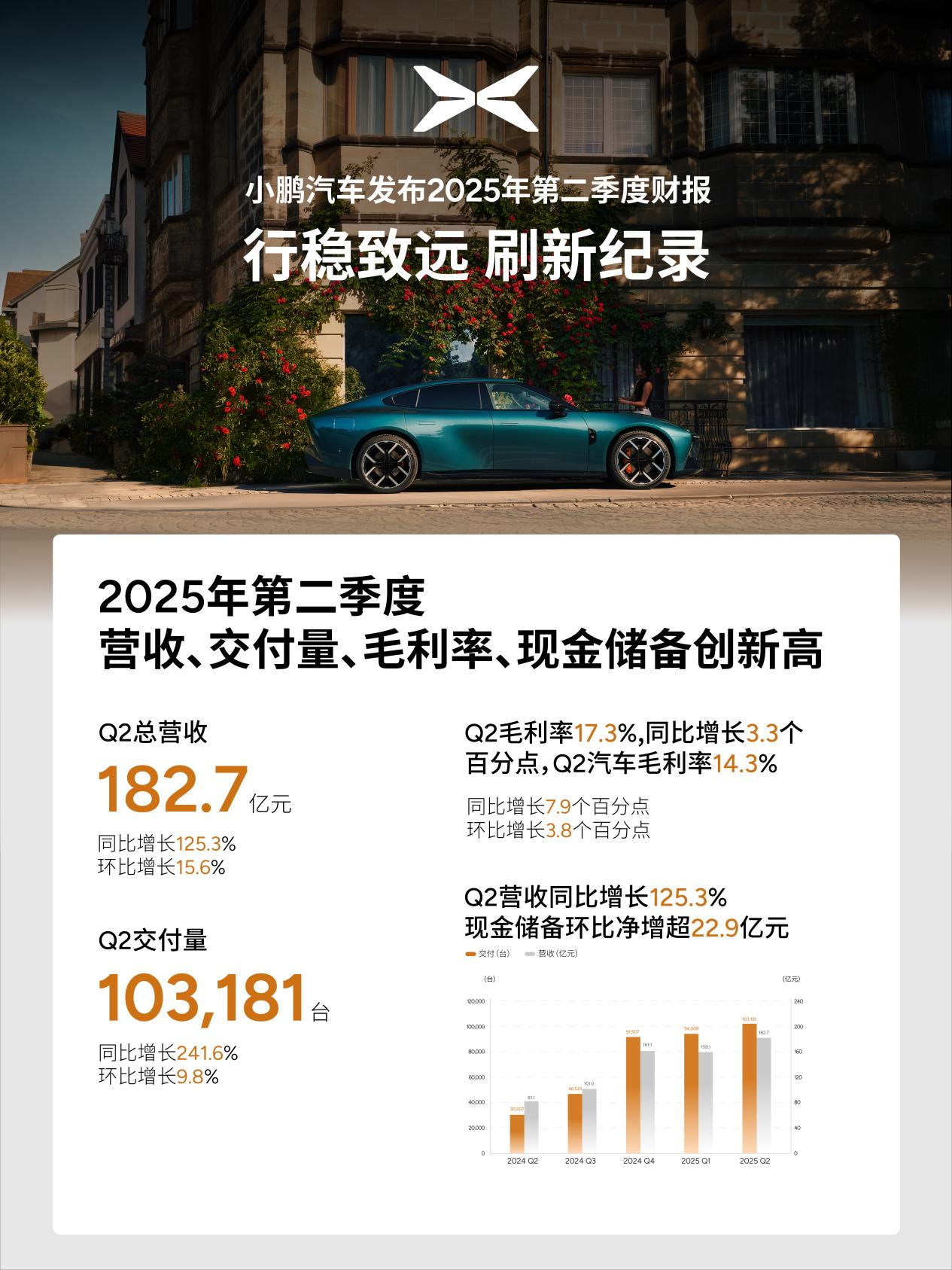 2025年二季度,小鹏汽车营收、交付量、毛利率和现金储备均创历史新高。
