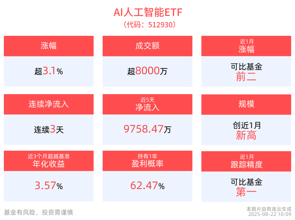 截至2025年8月22日 10:09,中证人工智能主题指数(930713)强势上涨3.26%,成分股寒武纪(688256)上涨14.67%,芯原股份(688521)上涨10.99%,中科曙光(603019)上涨9.79%,昆仑万维(300418),润泽科技(300442)等个股跟涨。AI人工智能ETF(512930)上涨3.19%,最新价报1.81元。