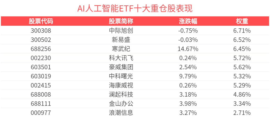 数据显示,截至2025年7月31日,中证人工智能主题指数(930713)前十大权重股分别为中际旭创(300308)、新易盛(300502)、寒武纪(688256)、科大讯飞(002230)、海康威视(002415)、豪威集团(603501)、中科曙光(603019)、澜起科技(688008)、金山办公(688111)、浪潮信息(000977),前十大权重股合计占比55.52%。
