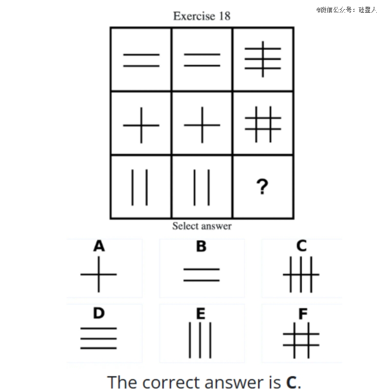 以此题为例,门萨智商测试是由数道图形推理题组成,在第18道测试题中,题目给出了一个3x3的九宫格,其中八个格子已经填上了由不同线条组成的图案,要求AI找出规律,并从六个选项中选择一个正确的图案填入第九个空格。根据规律,右下角的位置应该填C。