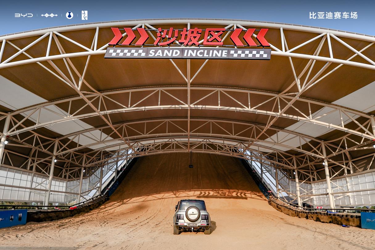 郑州全地形赛车场能够精准复刻沙漠、冰原等不同地形,背后其实是10余项专利技术的支撑,涉及材料学、工程学、控制技术等多个领域。比如,沙坡区的沙子配比经过了精准的测算,是比亚迪研发团队远赴阿拉善做沙漠采样分析后,历经百次测试确定沙型为小粒径细沙与坡度。据悉,沙坡区的坡面垂直高度为29.6米,坡度28°,整体填充了6200吨精准配比的沙子。值得一提的是,作为郑州赛车场的“镇场之宝”,拿到了吉尼斯世界纪录,是目前最大最高的冲沙测试场。
