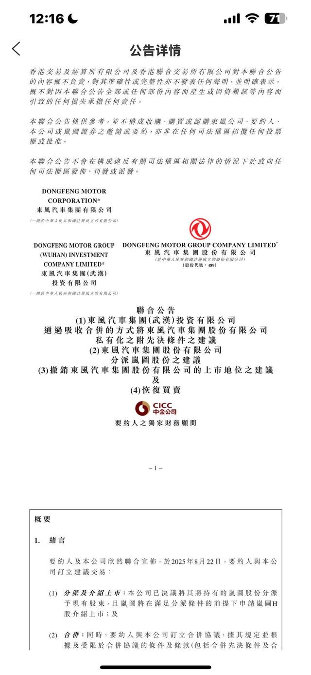 扬子晚报网8月23日讯(记者 范晓林 薄云峰)停牌十多天的东风集团股份迎来重大消息披露。8月22日晚间,东风集团股份发布公告称,子公司岚图汽车将以介绍上市方式登陆港股,东风集团股份将同步完成私有化退市。
