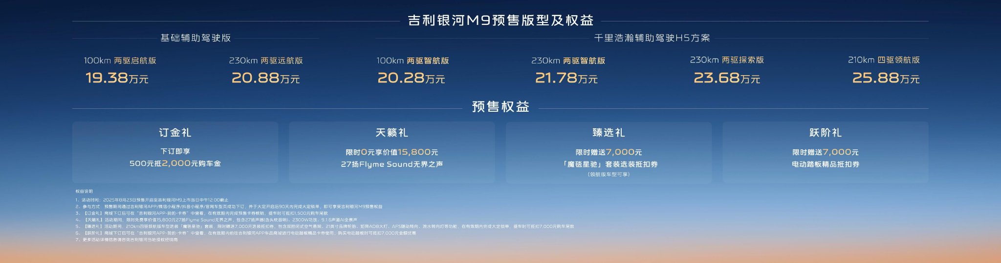 8月23日,吉利银河旗下首款“AI科技大六座旗舰SUV”——吉利银河M9正式开启全球预售,共推出6个版型,分别为210km四驱领航版、230km两驱探索版、230km两驱智航版、100km两驱智航版、以及230km两驱远航版、100km两驱启航版。预售价格为19.38万元——25.88万元。