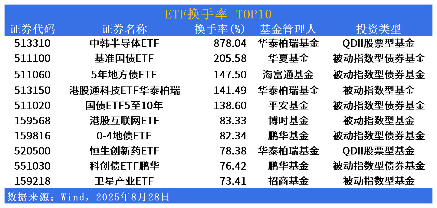 换手率方面,中韩半导体ETF(513310)换手率居首,达878%。基准国债ETF(511100)、5年地方债ETF(511060)、港股通科技ETF华泰柏瑞(513150)换手率居前。